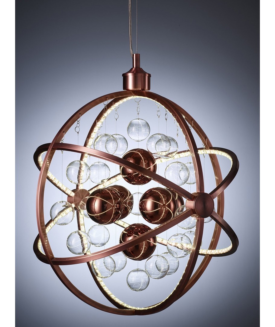 Galaxy Pendel i koppar är utförd i metall och glas, en annorlunda och fantastiskt snygg LED taklampa. Lampan har en futuristisk design och som namnet beskriver ger den associationer till galaxen.