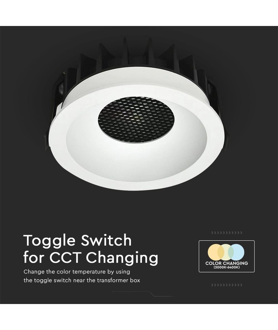 Upplev mångsidigheten och den höga kvaliteten med 24W Bländfri RA90 CCT Downlight Ø135mm med vit front och honungskaksdesign, som passar perfekt till ett hål på Ø115mm.