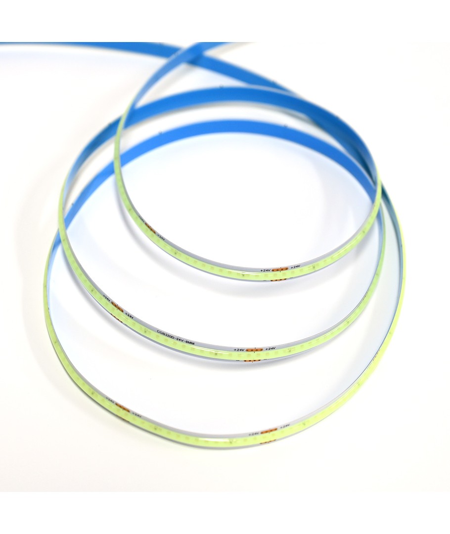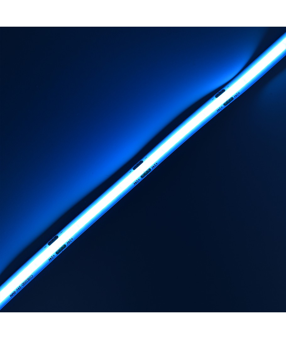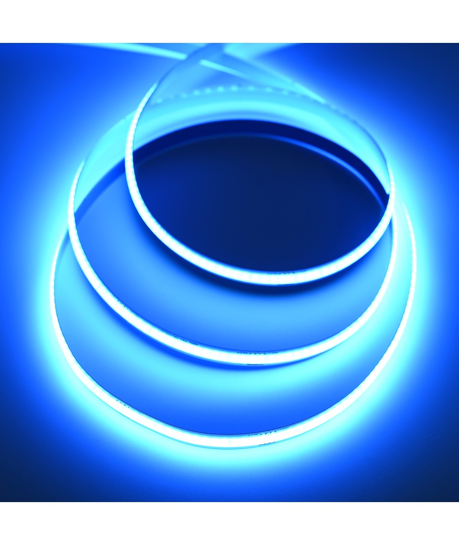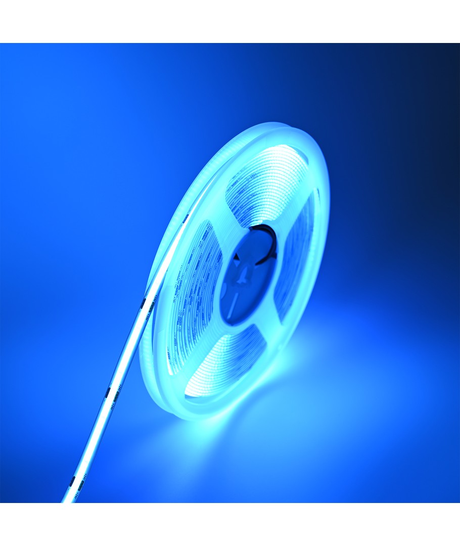 Enfärgad ljusblå COB LED strip med 320 LED per meter.