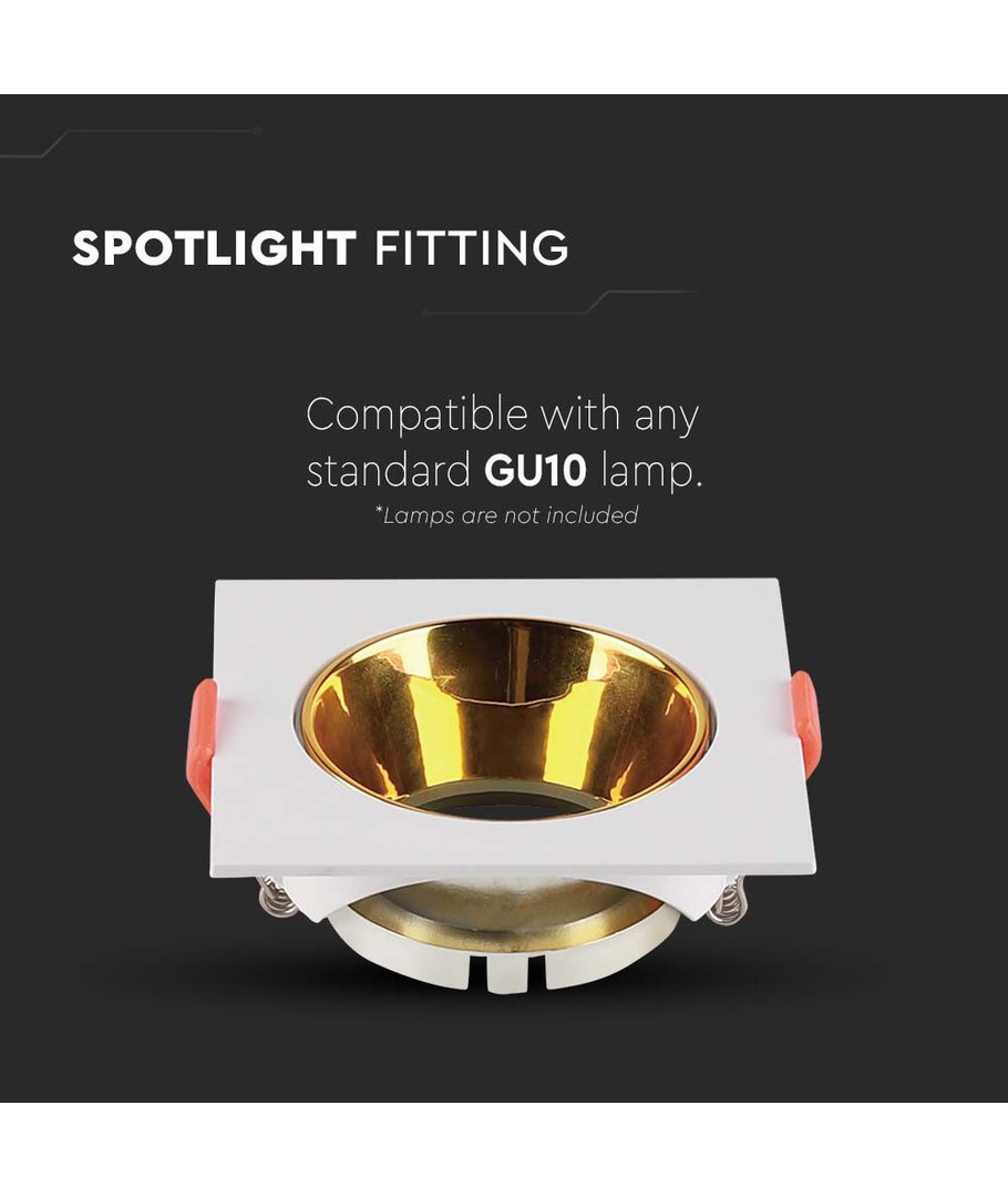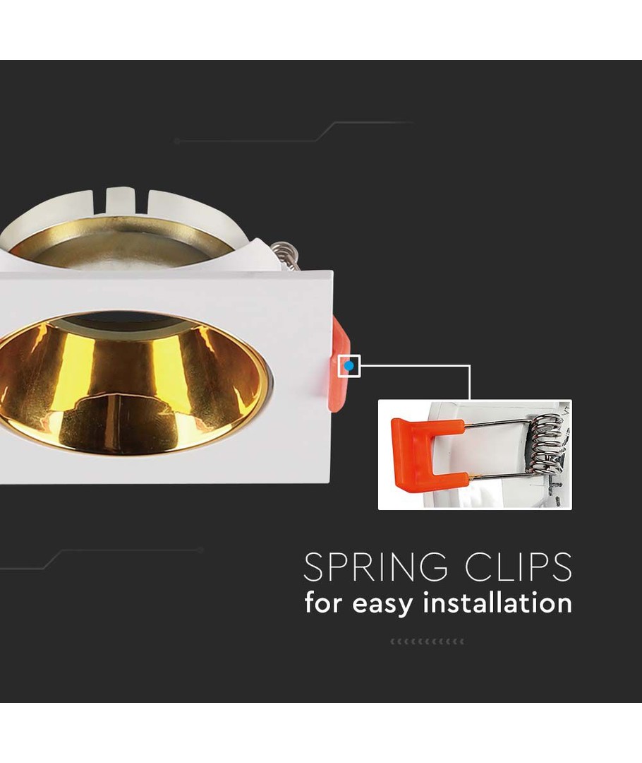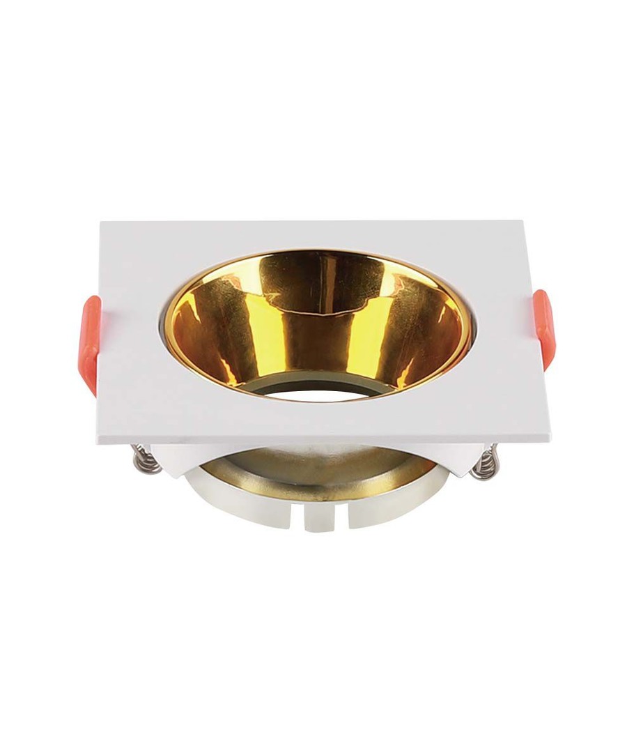 Lampan har en subtil vit fyrkantig ram i kombination med en guldreflektor, vilket ger ett elegant och sofistikerat utseende. Denna färgkombination passar utmärkt för att skapa ett stiligt och inbjudande ljus i din bostad eller på ditt kontor.