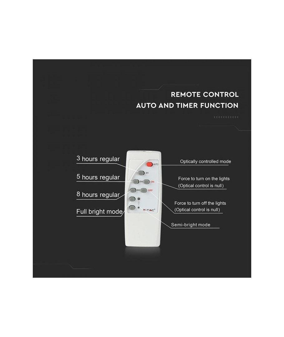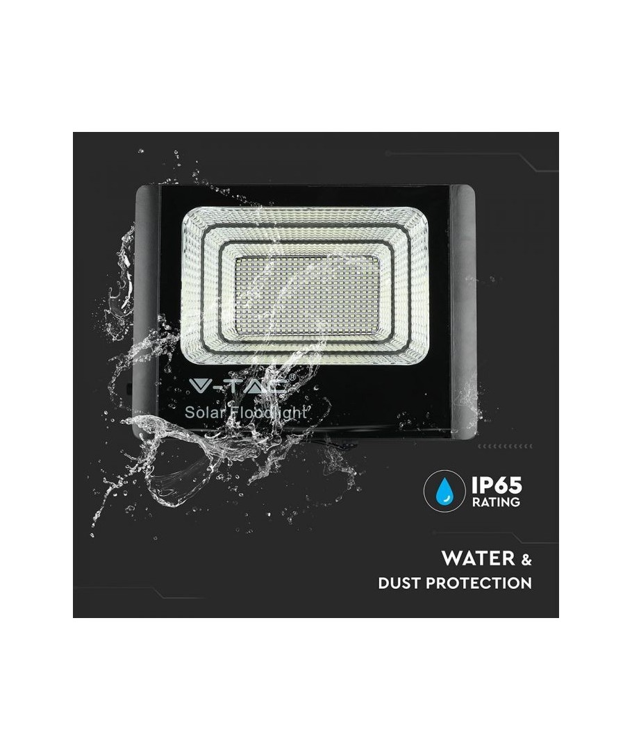 V-Tac 50W LED Solar strålkastare - Svart, en praktisk och energieffektiv lösning för utomhusbelysning. Denna strålkastare inkluderar en solcell och fjärrkontroll och är designad för att klara alla väderförhållanden med sin IP65-klassning. Den har även en praktisk timerfunktion som låter dig ställa in den så att den stängs av automatiskt efter en viss tidsperiod. Med en full laddningstid på endast 4 timmar kan denna projektor ge 8 timmars ljus. Den kommer också med en 5 meter lång sladd, vilket ger dig flexibiliteten att placera den där du behöver den.