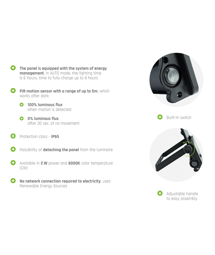 Strålkastaren kan enkelt placeras på gården, i trädgården, vid garageuppfarten eller på byggarbetsplatsen. Den automatiska sensorn, driven av solenergi, hjälper till att minska energikostnaderna och minskar ditt koldioxidavtryck.