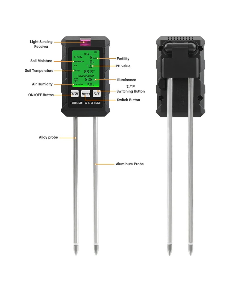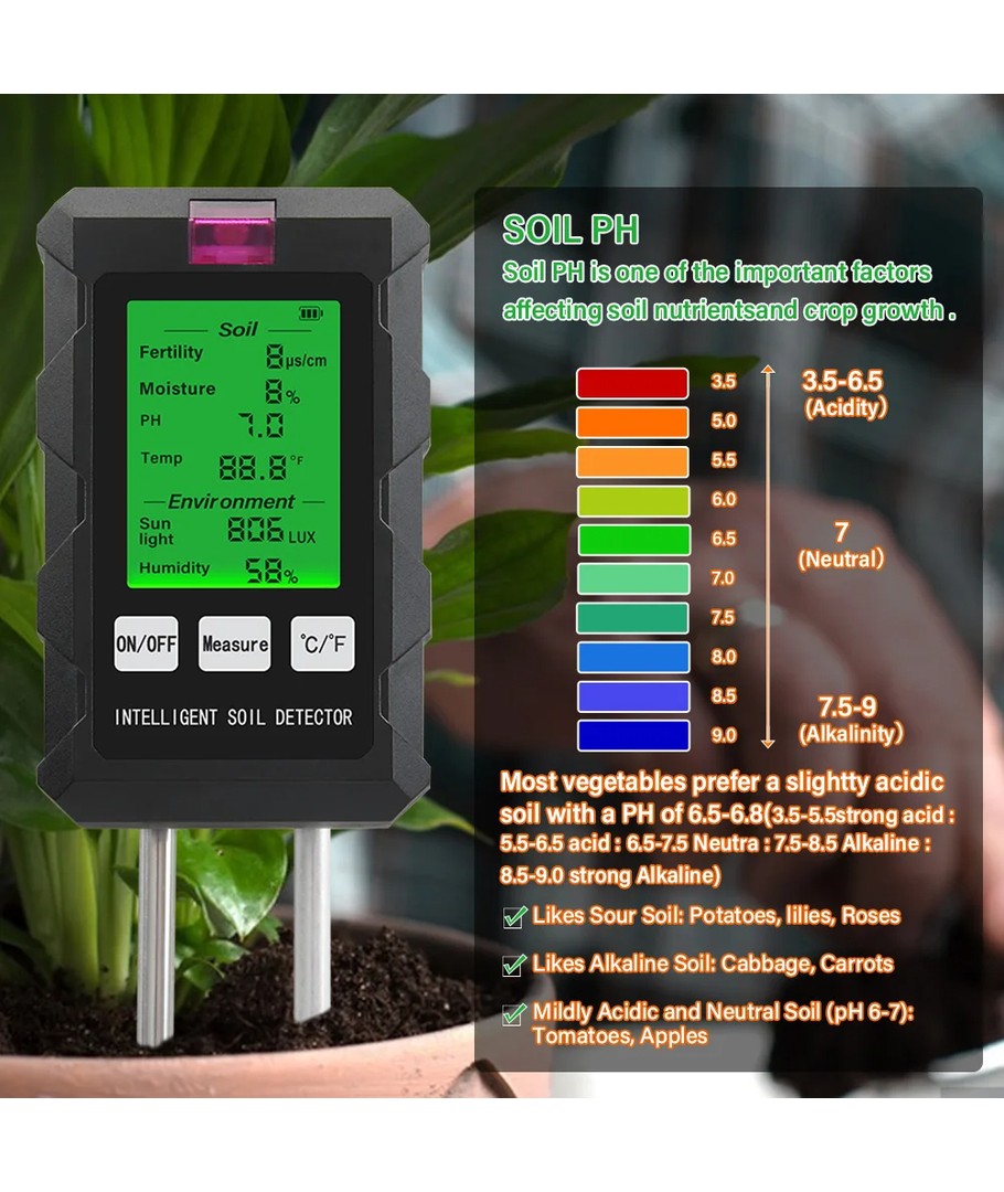 Upplev precision och mångsidighet med vår 6 i 1-mätare, som förenklar vården av dina växter genom att mäta pH, fukt, temperatur, ljusintensitet, näringsinnehåll i jorden samt luftfuktighet i en kompakt enhet.