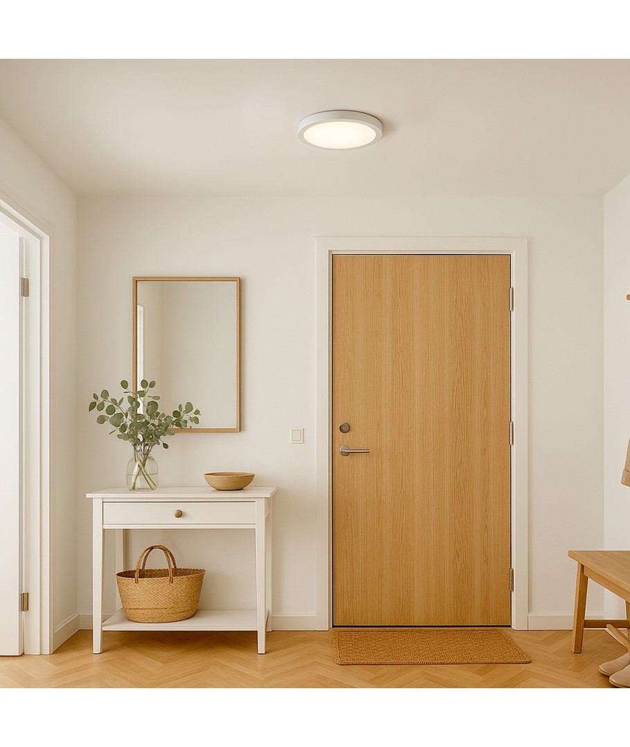Lampan har en vit kant och kommer med en integrerad ljuskälla, vilket innebär att du slipper tänka på byten eller extra tillbehör. Det breda spridningsområdet på 120 grader ser till att ljuset fördelas jämnt över det belysta området, samtidigt som den säkerställer en hög ljuskvalitet där färger framträder naturligt och vackert.