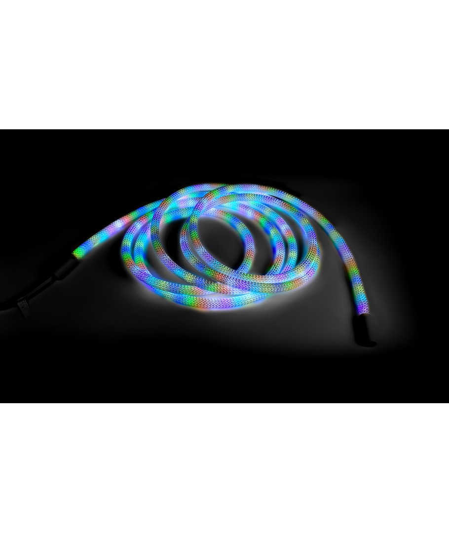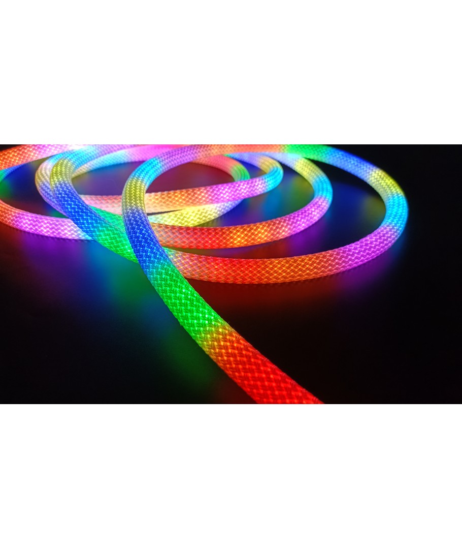 Upplev en värld av färger med vår 3W/m RGBIC Neon Flex strip med vävt rep - en 3 meter RGBIC neon flex, som ger ljus och liv till vilket rum som helst med sitt dynamiska färgspel och flexibla design.