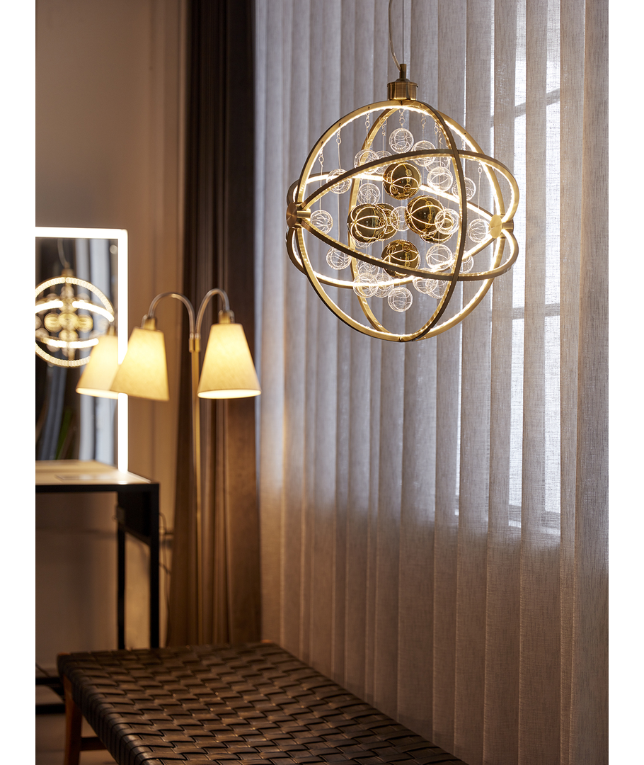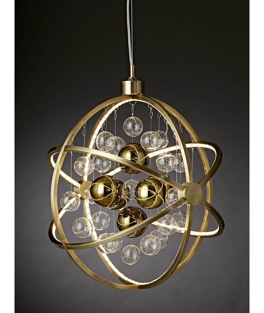 Galaxy Pendel i Antik Mässing - lampan är utförd i metall och glas, en annorlunda och fantastiskt snygg LED taklampa. Lampan har en futuristisk design och som namnet beskriver ger den associationer till galaxen.