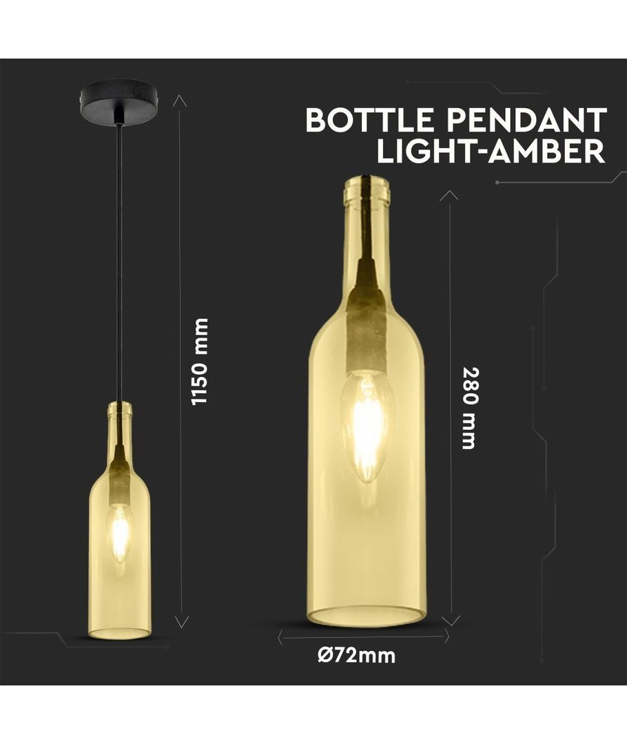 Modern och stilren belysning kompletteras elegant med denna bärnstenfärgade flaska pendellampa från V-Tac. Den distinkta och varma bärnstensfärgen ger en stämningsfull och inbjudande atmosfär, vilket gör den idealisk för alla hem och kommersiella miljöer.