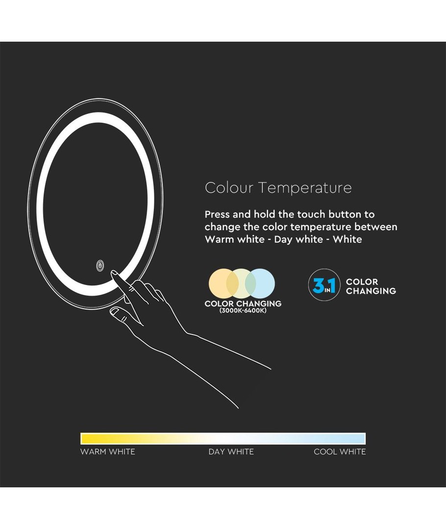 Denna rundformade spegelbelysning är utrustad med en touchströmbrytare, vilket gör det enkelt att justera ljusstyrkan efter dina behov. Genom CCT-justering kan du välja mellan olika färgtemperaturer för att skapa den perfekta atmosfären.
