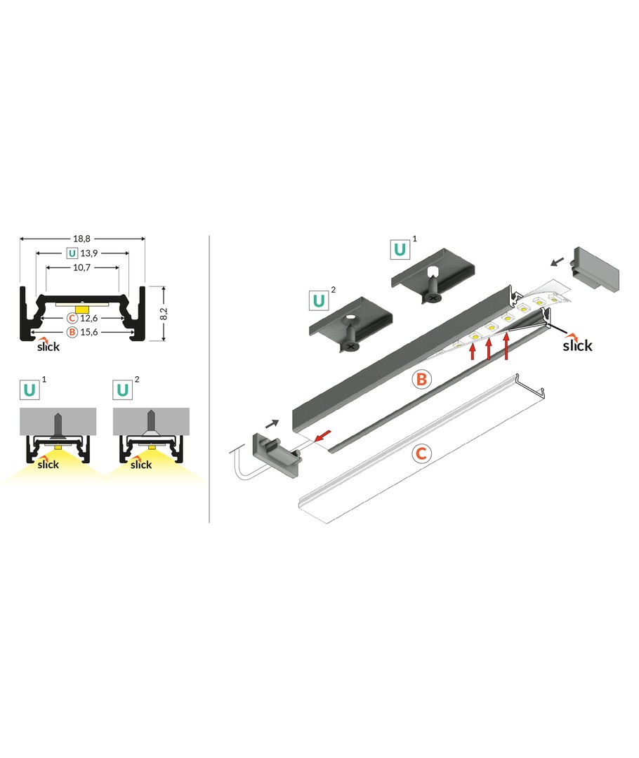 Obehandlad aluminium, påbyggnad, LED-skena