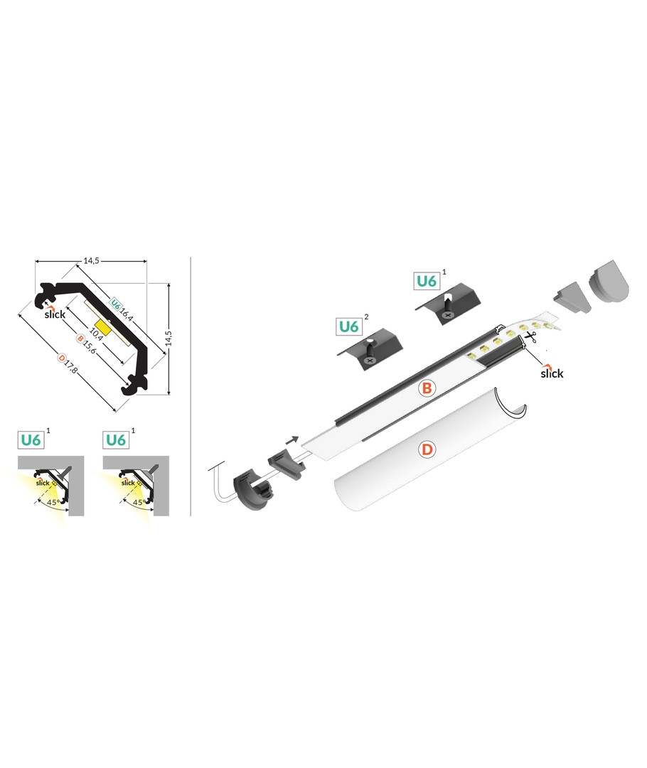 Svart anodiserad, hörn, LED-skena