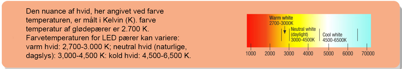 Varm vit (3000 Kelvin) skapar en mysig och mer gyllene kulör , vilket bidrar till att skapa en mer ombonad atmosfär, vilket gör att den oftast används hemma.