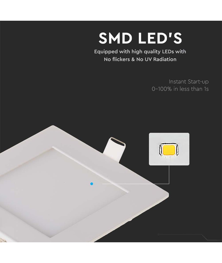 Denna fyrkantiga 6W LED Panel är utformad för att ge en jämn och effektiv belysning med sin ljusstyrka på 490 lm och en bred spridning på 120 grader. Detta säkerställer en jämn fördelning av ljuset i ditt valda utrymme.