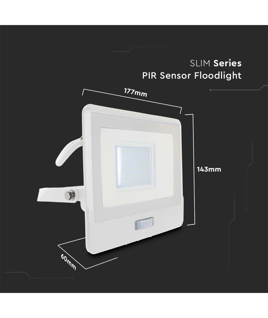 Den integrerade PIR-sensorn säkerställer att ljuset endast används när det behövs, vilket ökar energieffektiviteten avsevärt. Dessutom är strålkastaren designad för att klara tuffa väderförhållanden, med en robust IP65-klassificering som gör den perfekt för både inomhus- och utomhusbruk.