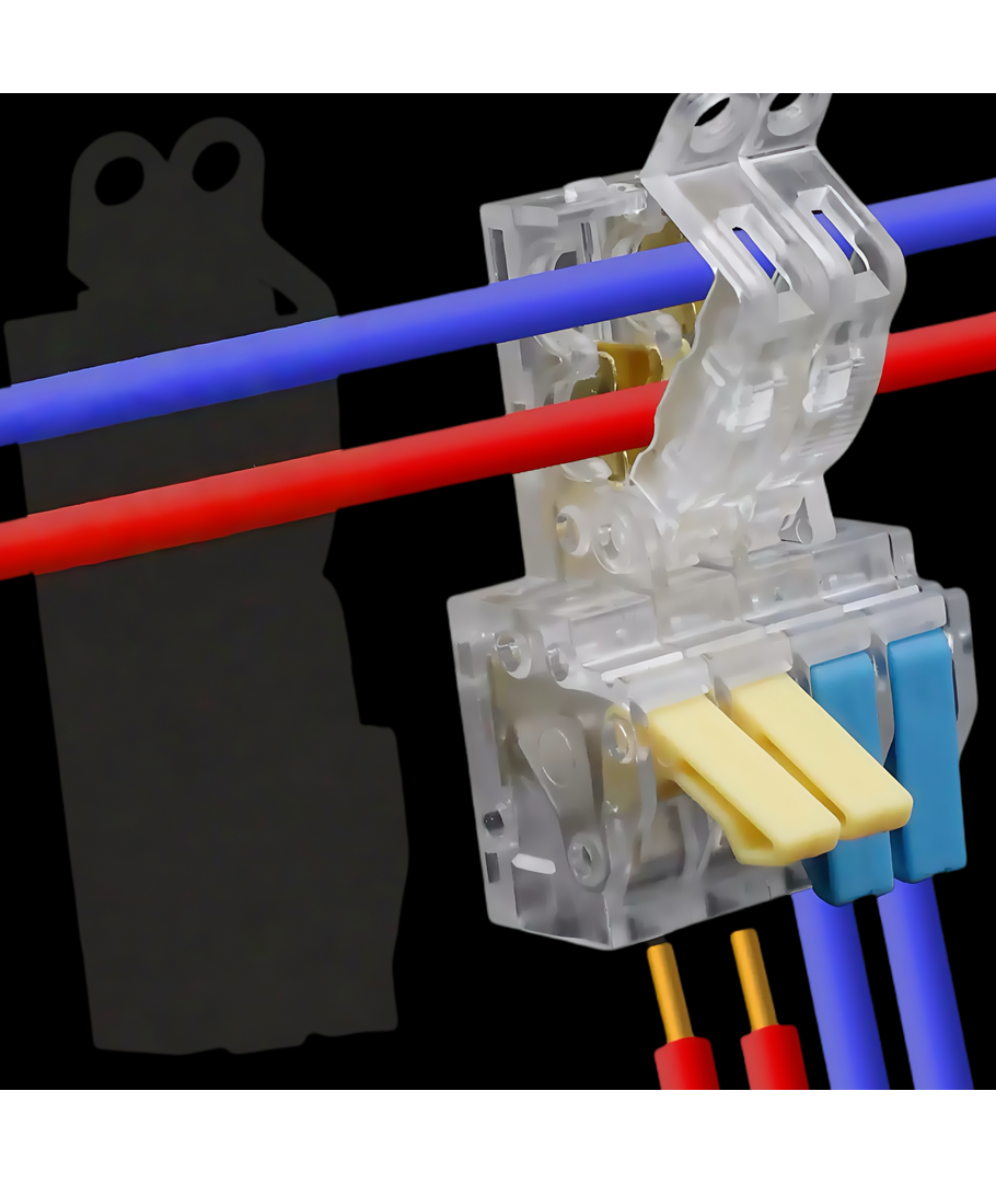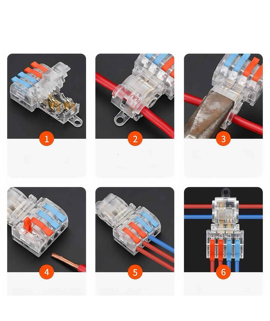De har ett praktiskt anslutningssystem, med orange vippbygel, som gör det enkelt att få in de mjuka ledarna i hålen.
