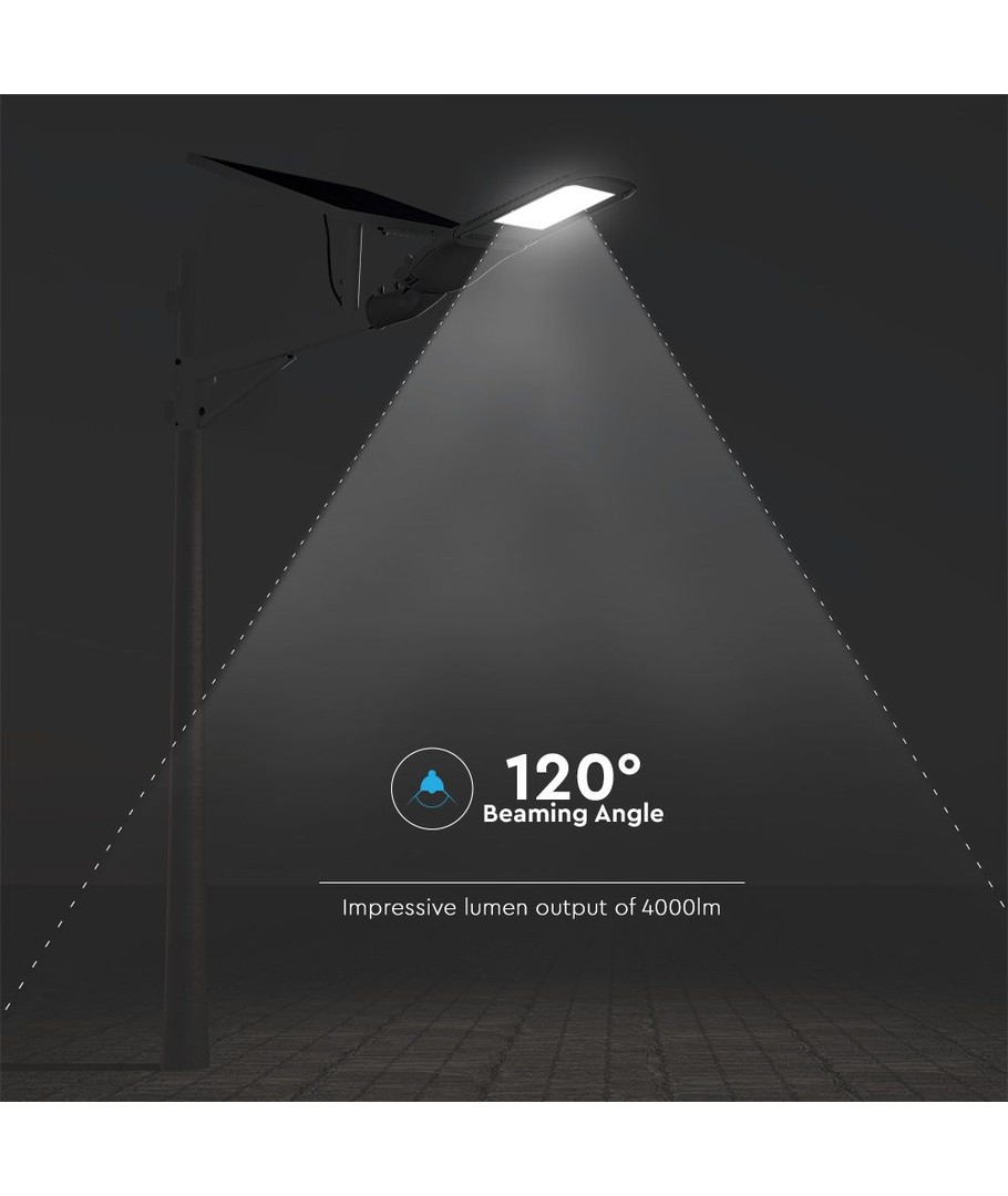 Denna solcellsdrivna gatubelysning erbjuder effektiv och miljövänlig belysning för utomhusområden. Med en kraftfull ljusstyrka på 3000 lumen och en bred spridningsvinkel på 120 grader, säkerställer den en jämn fördelning av ljuset över stora ytor.