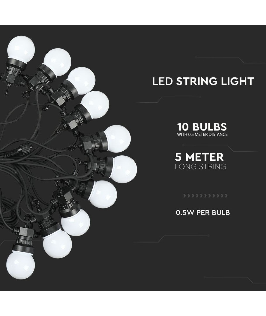 5 meter stänksäker ljusslinga med 10 st. 0,5W varmvita lampor.