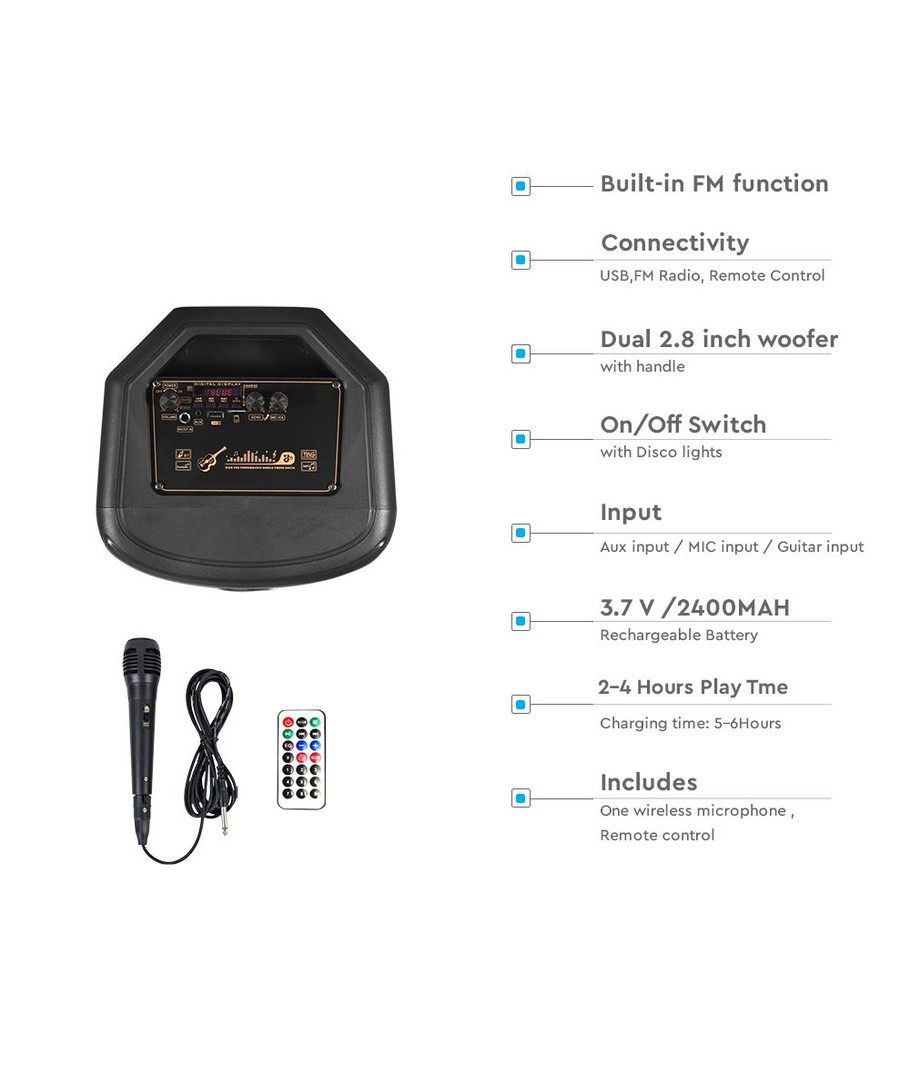 | Yderligere bemærkninger | Battery: 3.7V, 2400mAh Battery. Charging time: 5-6 Hours. Working time: 2-4 Hours. |