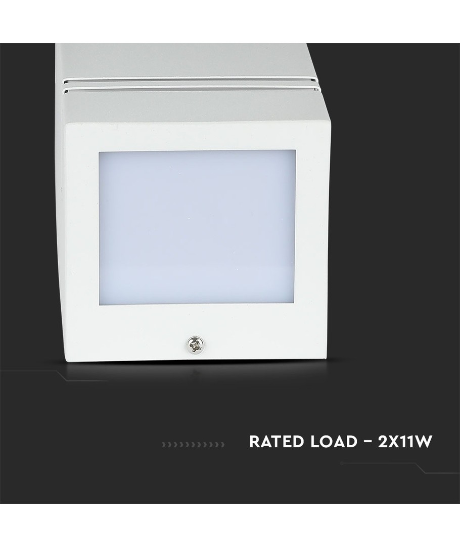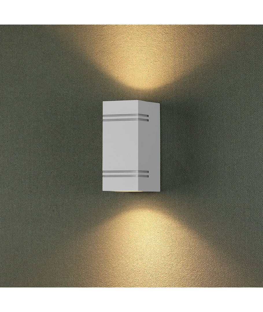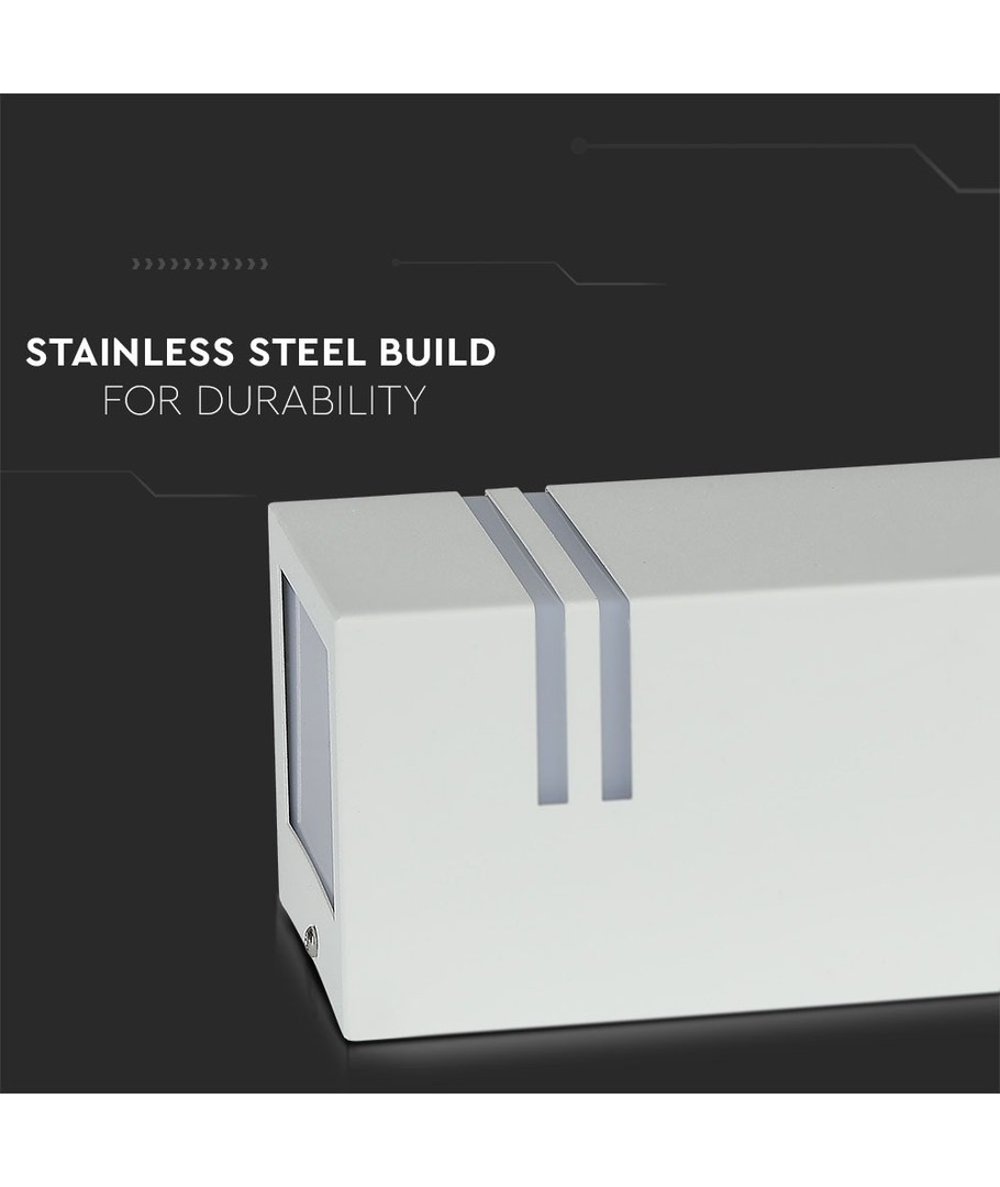 Vägglampan är tillverkad i rostfritt stål och har ett fyrkantigt vitt hus som ger ett modernt intryck. Dess dimensioner är 250 x 85 x 87 mm, vilket ger den en kompakt och stilren profil.