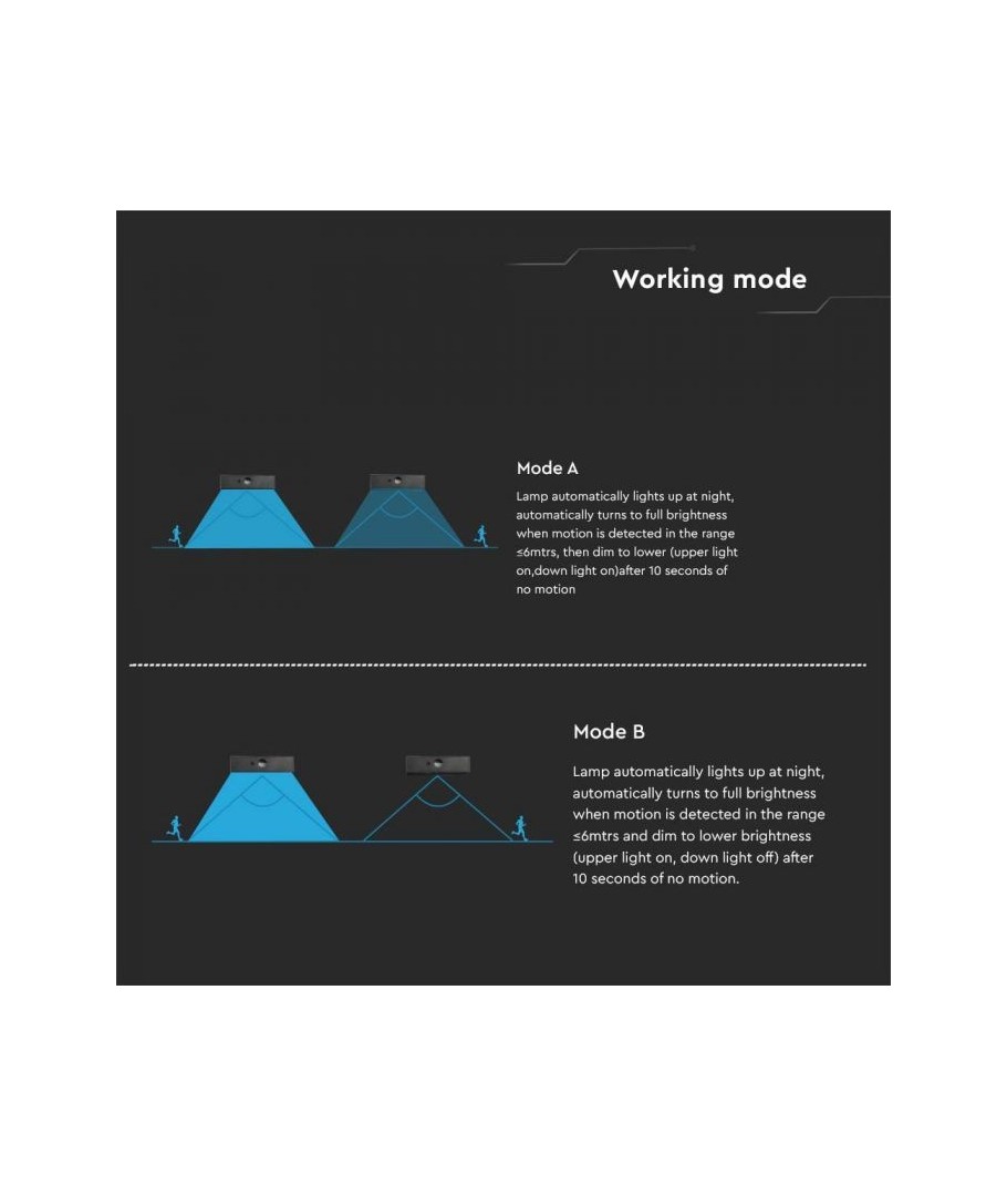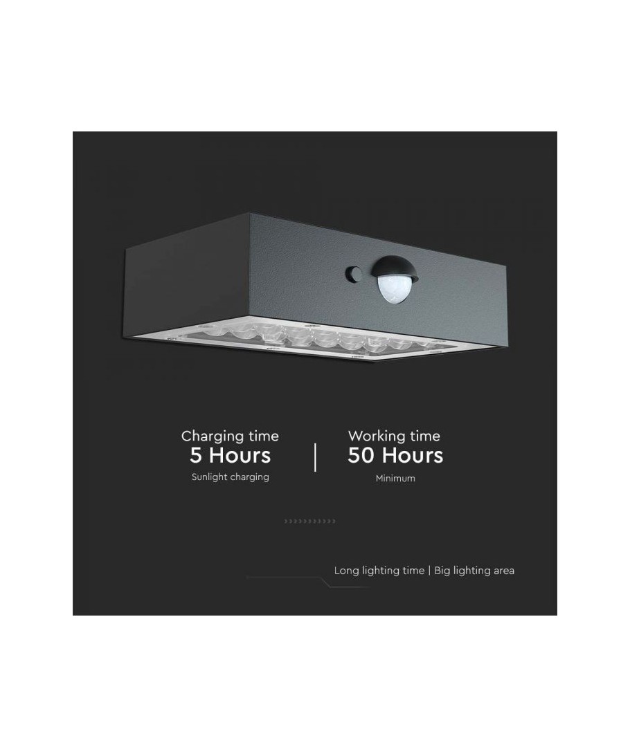 V-Tac 3W LED Solar vägglampa är den perfekta lösningen för utomhusbelysning. Den har en snygg svart finish och är utrustad med en sensor med en radie på 6 meter, som ser till att lampan tänds automatiskt när det är rörelse i närheten. Lampan har även två olika ljusvarianter. Med sin IP65-klassning är den vattentät och lämplig för utomhusbruk i alla väder. Det bästa är att den är soldriven, så den är energieffektiv och miljövänlig. Efter bara 5 timmars laddning kan lampan lysa i minst 50 timmar. Gör din utomhusbelysning smartare och mer energieffektiv med V-Tac 3W LED Solar vägglampa.