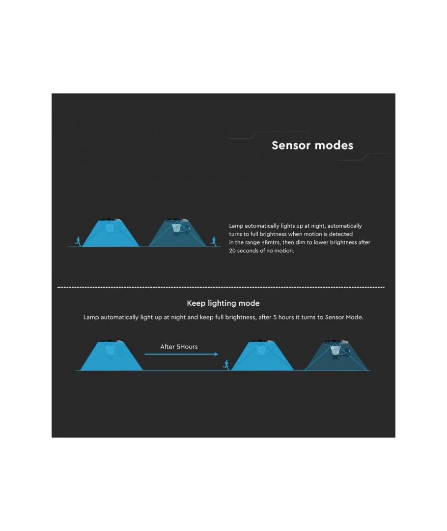 Denna solcellsvägglampa är utrustad med en sensor som automatiskt aktiverar ljuset när rörelse upptäcks, vilket bidrar till ökad säkerhet och energieffektivitet. Med sina många funktioner är lampan ett perfekt val för dem som söker pålitlig utomhusbelysning.