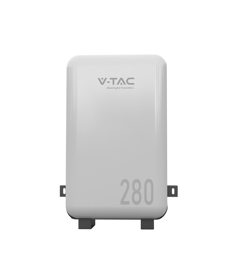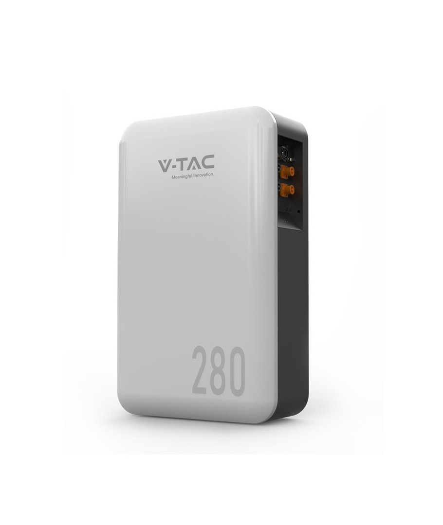 V-Tac 14,33 kWh solcellsbatteri som kan monteras utomhus. Det är möjligt att parallellkoppla flera VT-48280-W2-batterier med hjälp av ett batteri-till-batteri-kabel. Du hittar länken längre ner på sidan. VT-48280-W2 14,33 kW litiumbatteri är det idealiska valet för att lagra överskottsolenergi från dina solpaneler. Du kan njuta av friheten att använda din egen solenergi när solen inte skiner. Med detta batteri har du möjlighet att alltid ha ström tillgänglig, oavsett väderförhållanden eller tid på dygnet. Med en imponerande cykellivslängd på över 5000 gånger får du ett batteri som kommer att hålla i många år och ger dig en enastående stabilitet med 5 års tillverkargaranti.